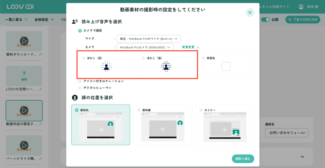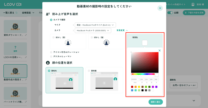 録画素材の撮影時の設定画面にて、「背景変更」をクリックします。