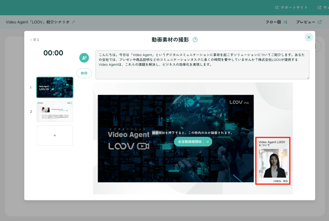 登壇者がスライドを表示しながら話すような構成で、 セミナーやプレゼン動画に適した自然な表現が可能になります。