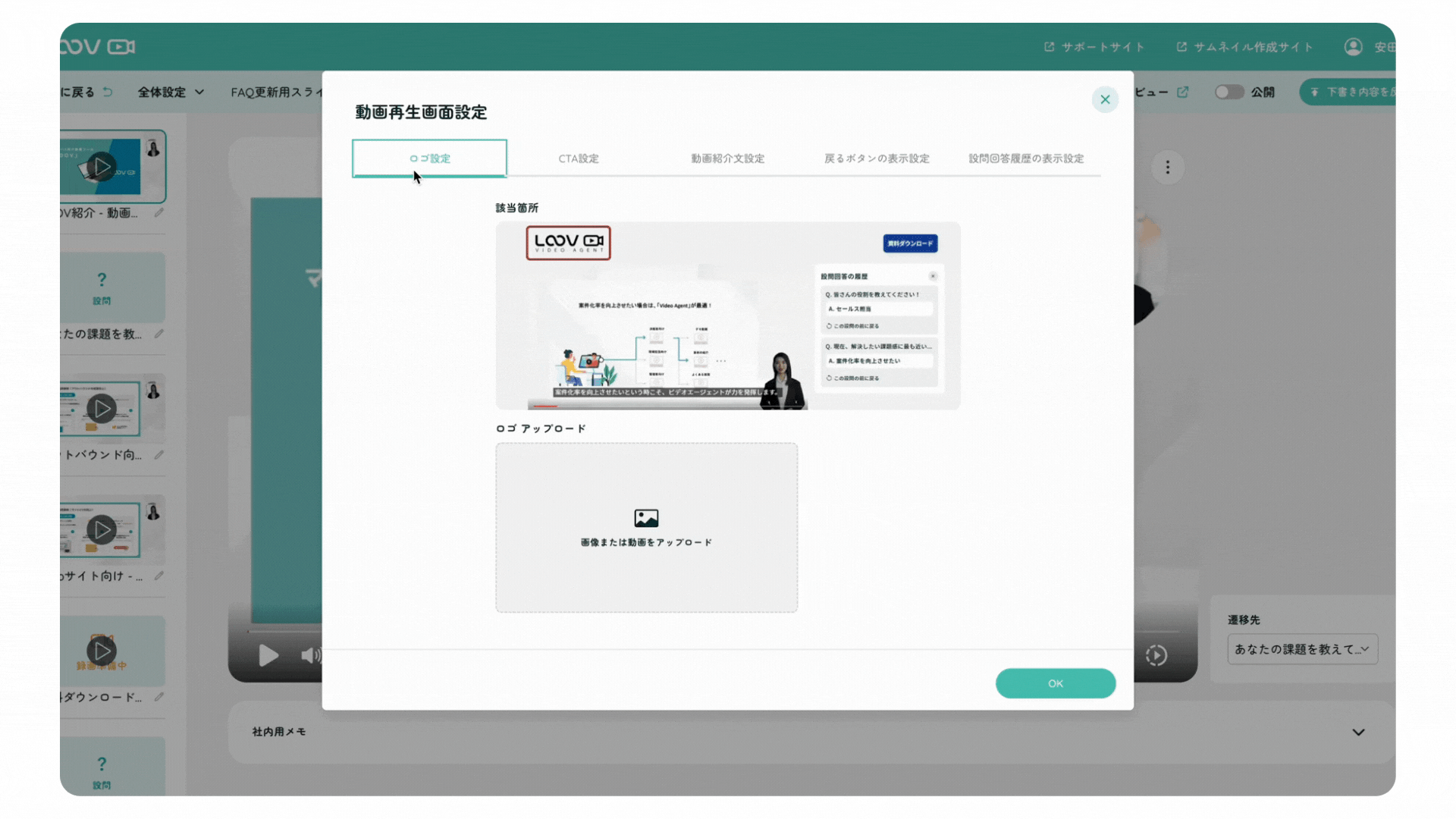 全体設定 > 「動画再生画面設定」をクリックすると、モーダルウィンドウが表示される形式に変更されました