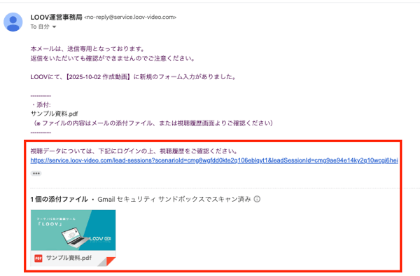 添付されたファイルは、CV通知メールに自動で反映されます ※ CV通知のCV情報を記載するのトグルをONにすると、メールに実際のファイルが添付されて届きます