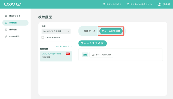 視聴履歴画面の「フォーム回答結果」より、添付ファイルを確認することができます