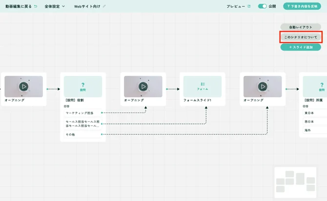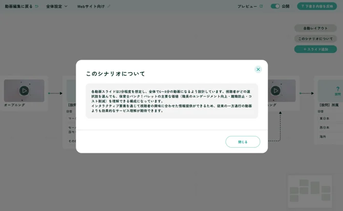 フロー図画面の 「このシナリオについて」 をクリックすると、AIがどのような意図で構成を組み立てたのか、その背景や流れが表示されます。