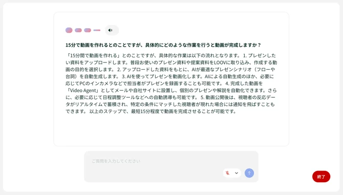 動画の途中にAIと対話ができるスライドを挿入できる新機能です。視聴者はテキストまたは音声で質問を入力し、AIが事前に設定した資料やサイト情報をもとに回答します。