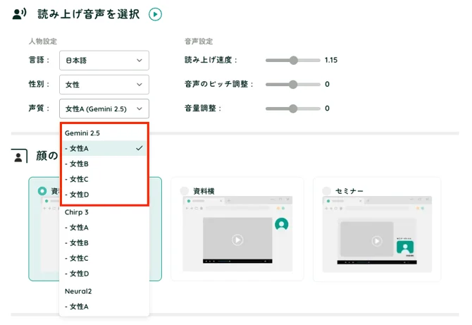 女性ボイス | Gemini 2.5 女性A / 女性B / 女性C / 女性D |