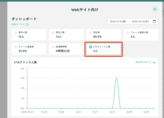 ダッシュボード上部に 「CTAクリック人数」 を追加しました。指定した期間内のCTAクリック人数を確認でき、グラフ表示にも対応しています。