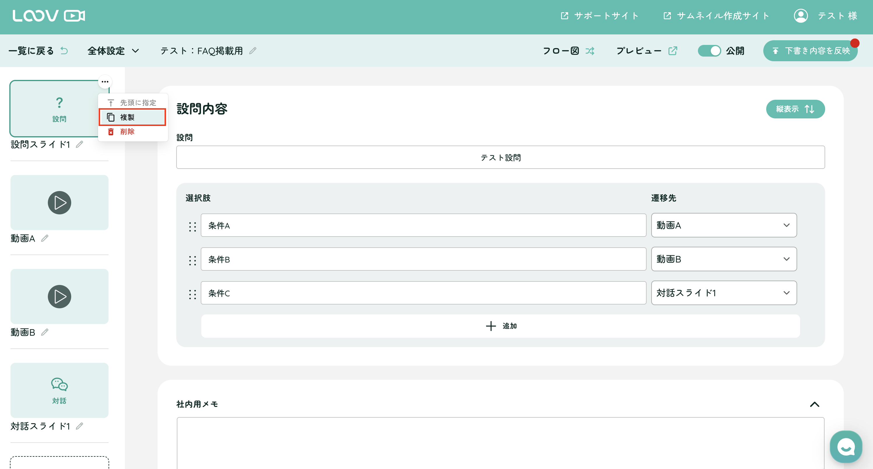 フロー図画面・スライド一覧画面のどちらからも操作が可能です。