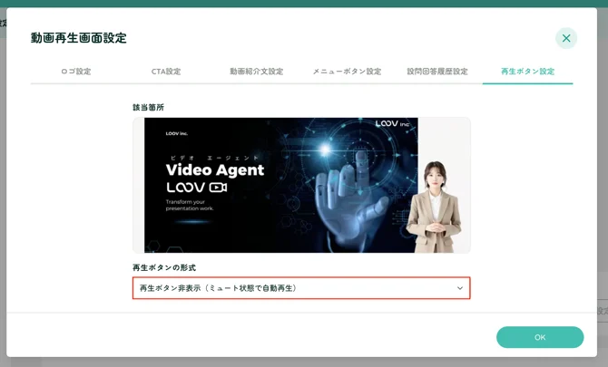 プルダウンより「再生ボタン非表示(ミュート状態で自動再生)」を選択し、OKをクリックします。