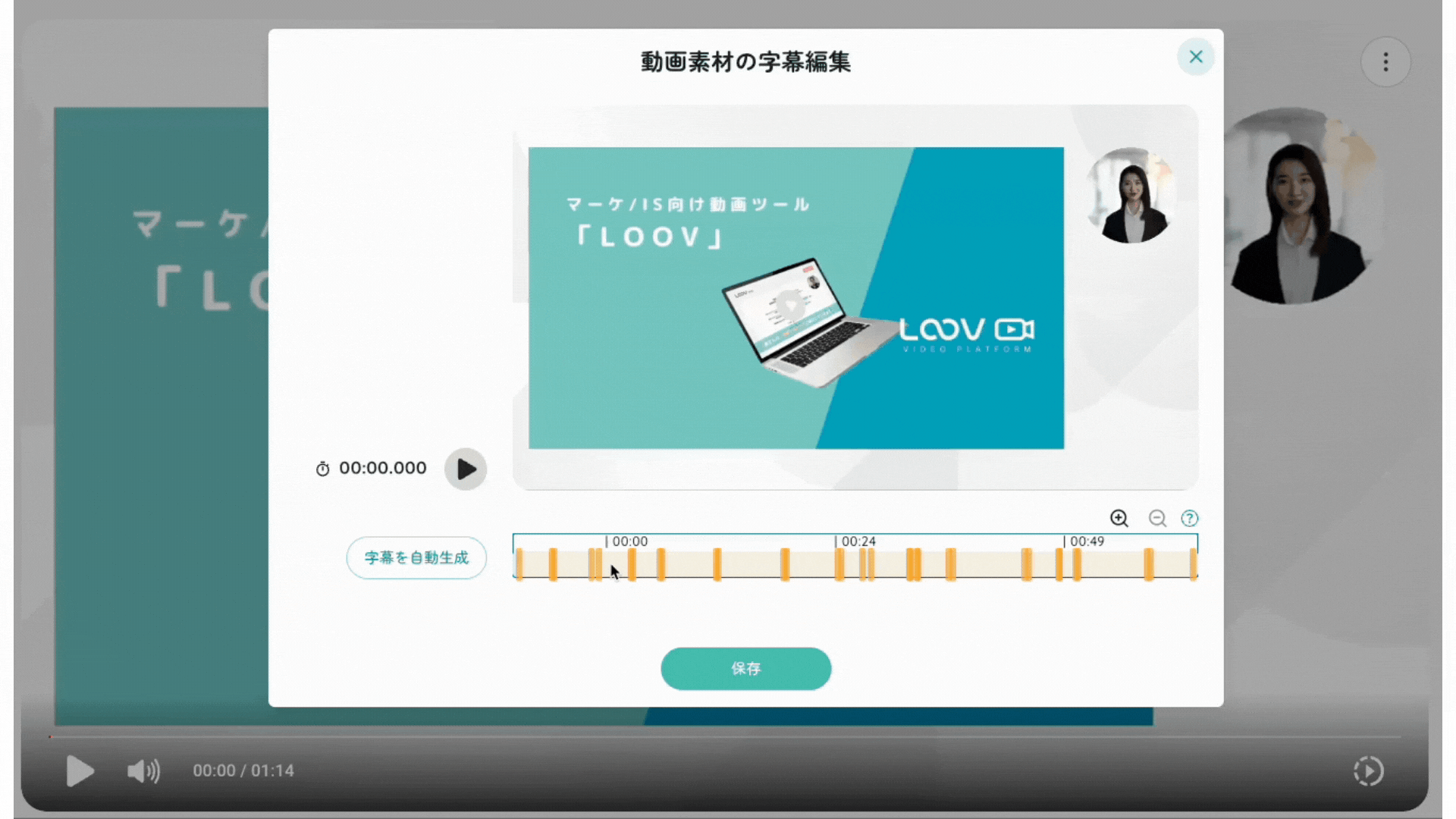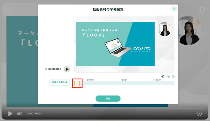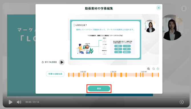 編集が完了したら、画面右上の「保存」ボタンをクリックしてください。 保存が完了すると、テロップが動画に反映されます。
