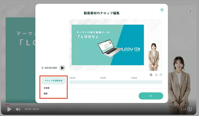 [テロップを自動生成] をクリックし、言語を選択すると自動で字幕が生成されます。
