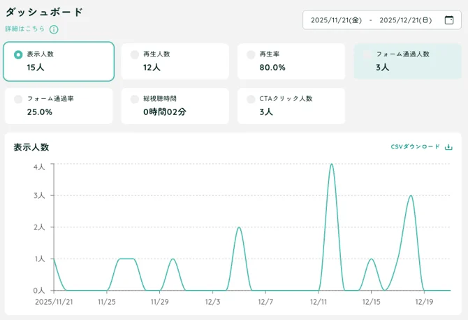 ダッシュボード機能では、指定期間における日毎の「表示数」や「再生率」などの指標を確認できます。