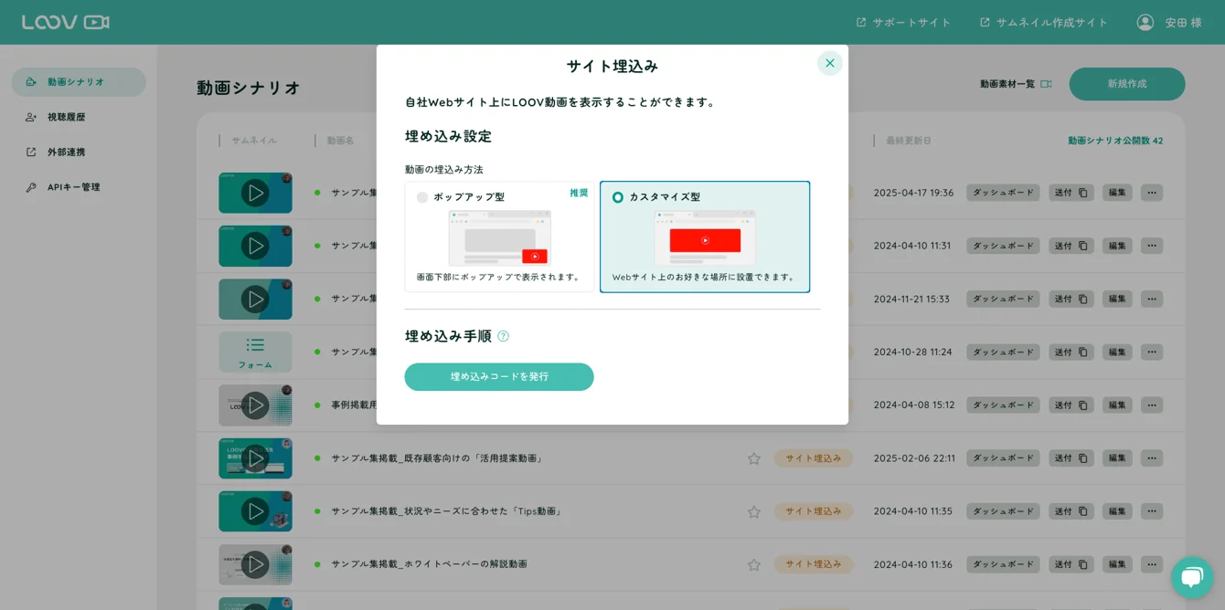 LOOVでは、作成した動画を 自社サイトに埋め込む方法 として、以下の2つの形式を用意しています。