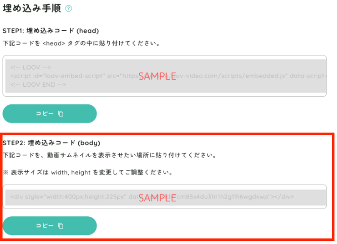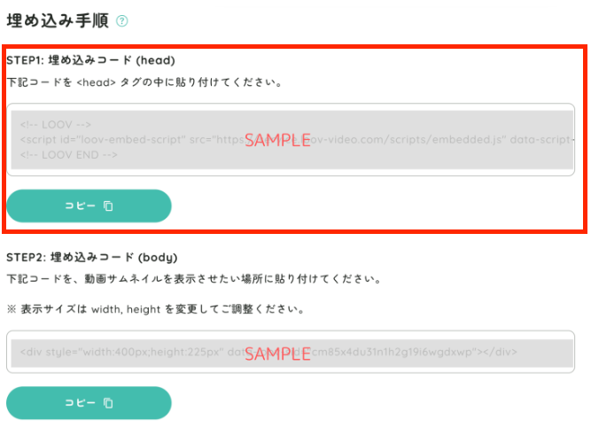 続いて、下部に表示される bodyタグ用コード をコピーし、動画を表示したい位置 に貼り付けます。