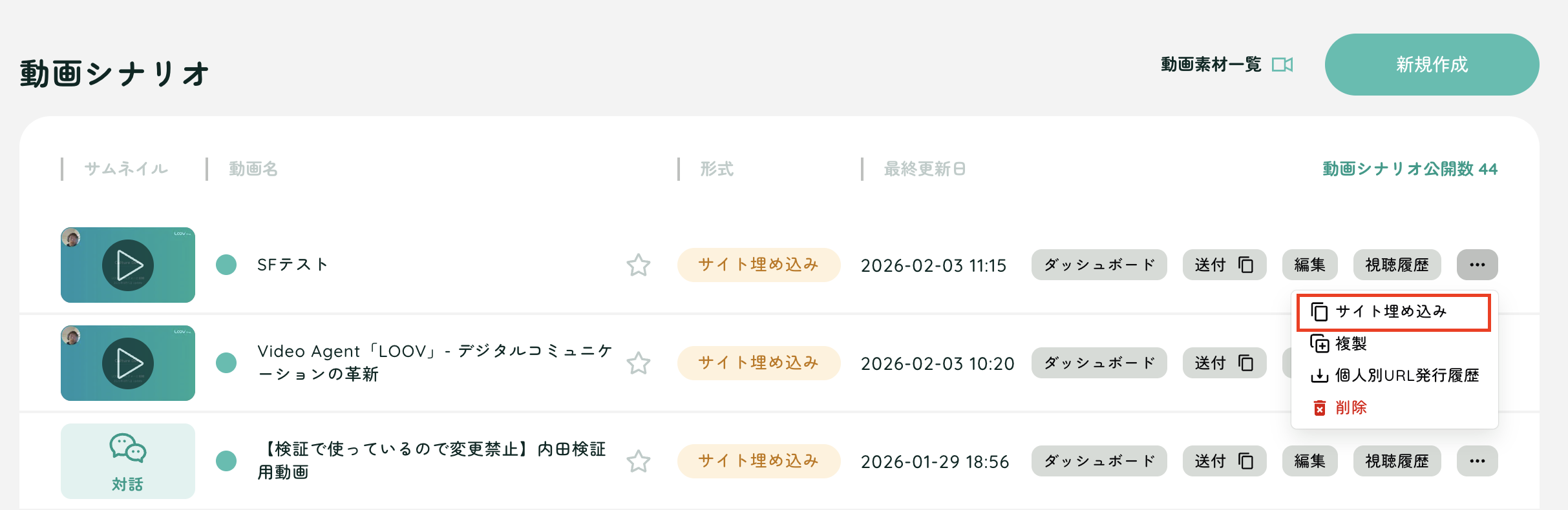 「動画一覧メニュー」内の該当の動画の「サイト埋め込み」を押下します。