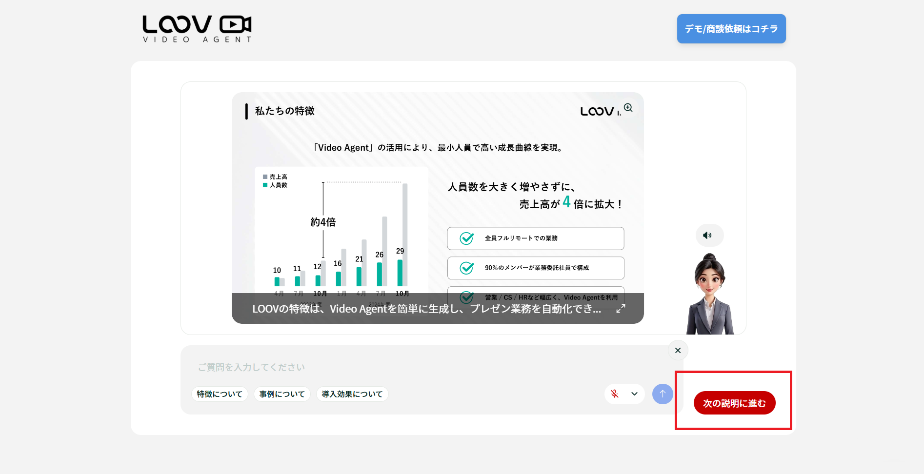 動画の途中で、視聴者がAIとやりとりできるスライドです。質問はテキスト/音声のどちらでも可能で、あらかじめ指定したサイトや資料をもとに、AIが即時回答を返します。