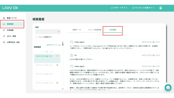 視聴者とAIエージェントの対話履歴は、視聴履歴メニュー内の「対話履歴」より確認がいただけます。