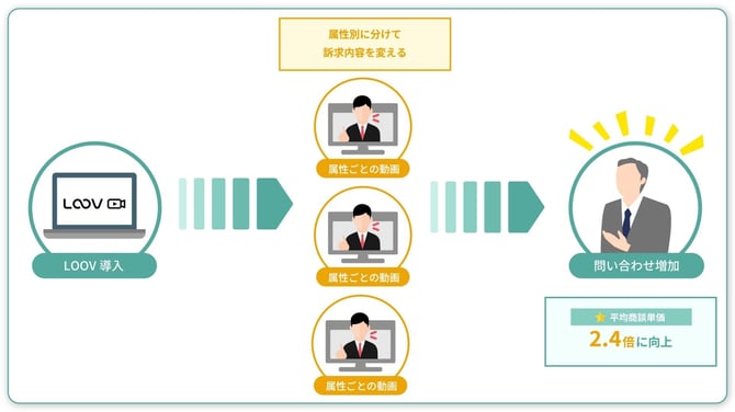 属性別動画で「経営層向け」「IT部門向け」「事業部門向け」に分けて訴求内容を変えることで、それぞれの立場に応じた価値提案ができるようになりました。 特に経営層向けの動画視聴者からの問い合わせが増加し、平均商談単価が2.4倍に向上しました。