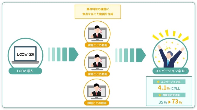 LOOV導入後、製造業には「原価管理機能」、小売業には「在庫管理連携」など、業界特有の課題に焦点を当てた動画を作成しました。 その結果、コンバージョン率が4.1%に向上し、さらに商談後の受注率も35%から73%に大幅改善しました。