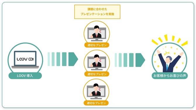 B社様のお客様は複雑な課題をお持ちで、サービスサイト上で適切な訴求ができずにお困りでした。LOOVをご導入後、「3つの質問で課題を明らかにし、適切なプレゼンテーションを実施」することができ、お客様から「このサービスを探していたんです!」とお喜びいただくことができました。