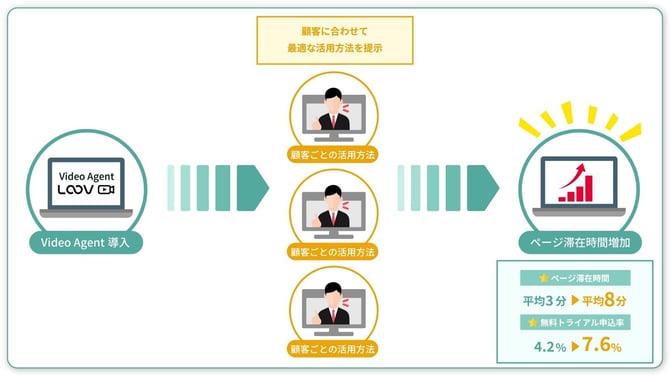 VideoAgentによる診断動画を導入後、顧客の業務課題、現在の環境、組織規模に基づいて最適な活用方法を提示するようにしました。 その結果、ページ滞在時間が平均3分から8分に延び、無料トライアル申込率が4.2%から7.6%に向上しました。