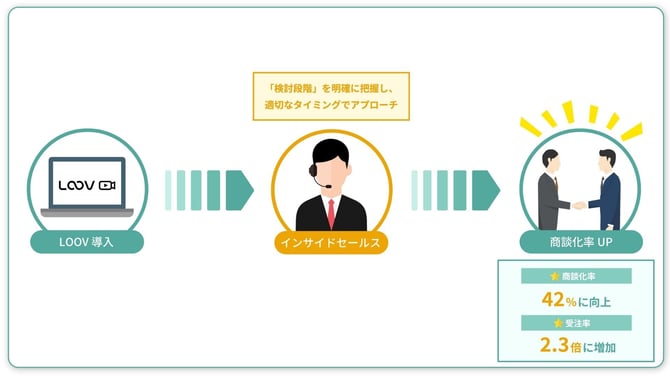 Video Agentによる課題ヒアリング動画を導入し、「検討段階」を明確に把握することで、インサイドセールスチームが適切なタイミングでアプローチできるようになりました。 その結果、商談化率が42%まで向上し、さらに受注率も従来の2.3倍に改善されました。