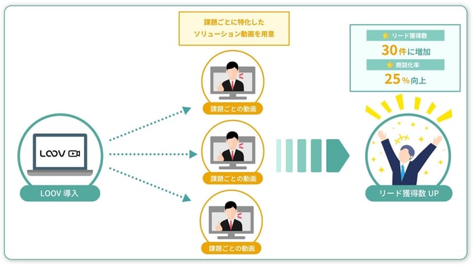 LOOV導入後、訪問者の課題を「業務効率化」「コスト削減」「売上向上」の3つに分類し、それぞれに特化したソリューション動画を用意しました。 結果として、月間リード獲得数が30件まで増加し、さらに事前の課題ヒアリングにより商談化率も25%向上しました。