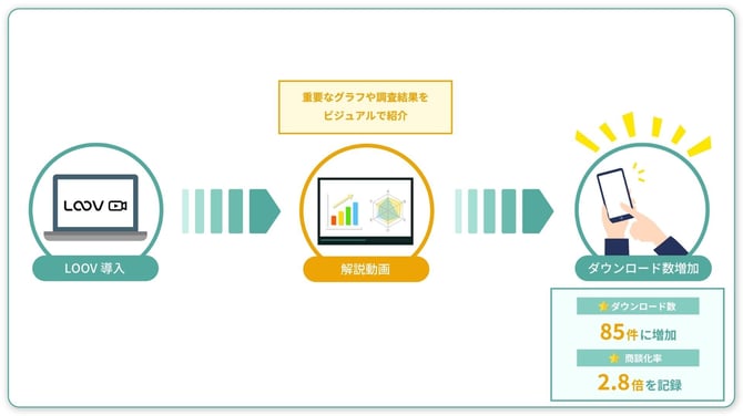 LOOV導入により、「ホワイトペーパーの解説動画」を作成し、重要なグラフや調査結果をビジュアルで紹介するようにしました。 結果として、月間ダウンロード数が85件に増加し、さらに動画視聴者の商談化率は通常の2.8倍を記録しました。