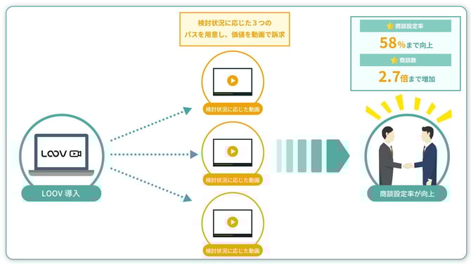 LOOV導入により、検討状況に応じた3つのパス(即商談/オンライン相談/資料提供)を用意し、それぞれの価値を動画で訴求しました。 特に「30分オンライン相談」という選択肢を設けたことで、従来は商談を断っていた情報収集段階の見込み客も気軽に相談できるようになりました。