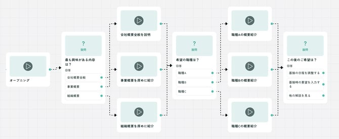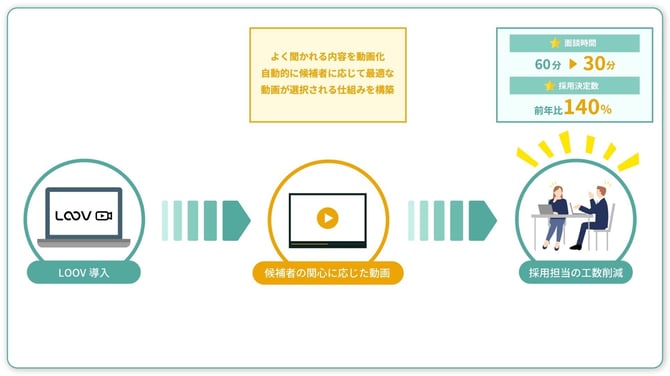 LOOV導入により、会社説明、福利厚生、キャリアパスなど、よく聞かれる内容を動画化。候補者の関心に応じて、自動的に最適な動画が選択される仕組みを構築しました。