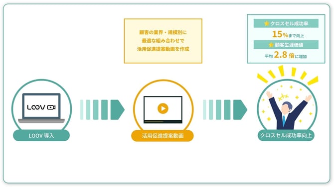 活用促進提案動画により、顧客の現状と「あるべき姿」のギャップを可視化し、段階的な成長パスを提示できます。さらに、同業他社の成功事例を交えることで、「うちでもできるかも」という期待感を醸成し、追加投資への心理的ハードルを下げることができます。