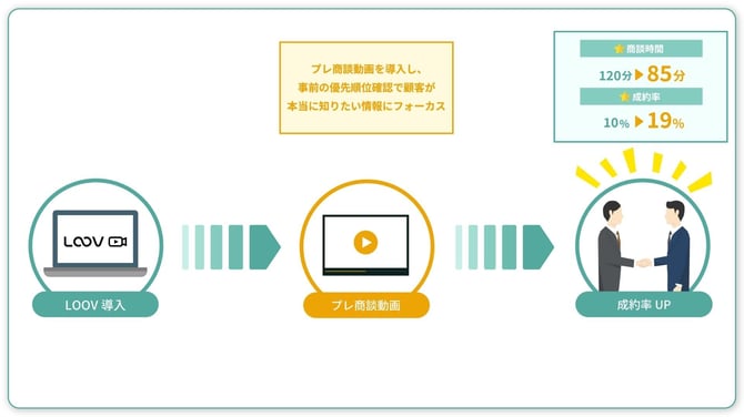 結果として、商談時間が平均120分から85分に短縮され、かつ成約率は10%から19%に向上。営業生産性が大幅に改善されました。
