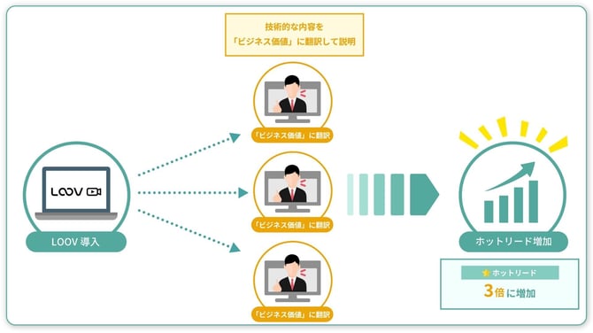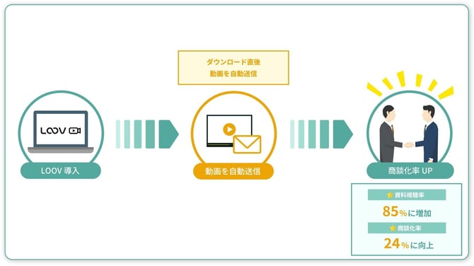 LOOV導入により、ダウンロード直後に営業担当者が解説する形で「3分で分かるホワイトペーパーの解説」動画を自動送信。さらに、資料内の重要なグラフや図表を解説し、「データが示す意味」を分かりやすく解説。