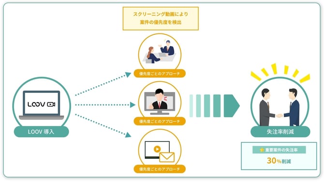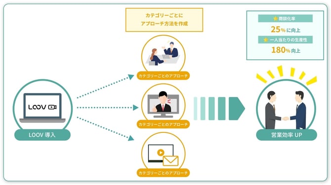 LOOV導入により、スクリーニング動画で自動的に3つのカテゴリーに分類。「予算確保済み」の20%にはベテラン営業が即日アプローチ、「検討中」の30%には週1回のフォロー、「情報収集」の50%には月2回、LOOV動画をメール配信してナーチャリングを行うという体制を構築しました。