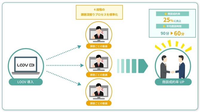 結果として、商談成約率が25%に向上し、平均商談時間も90分から60分に短縮されました。