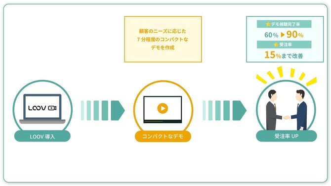 LOOV導入により、顧客のニーズに応じた7分程度のコンパクトなデモを作成。営業活動に課題を持つ企業には「リード管理→商談管理→売上予測」の3機能のみをデモし、それぞれで「月5時間の時間削減」という具体的な効果を訴求しました。