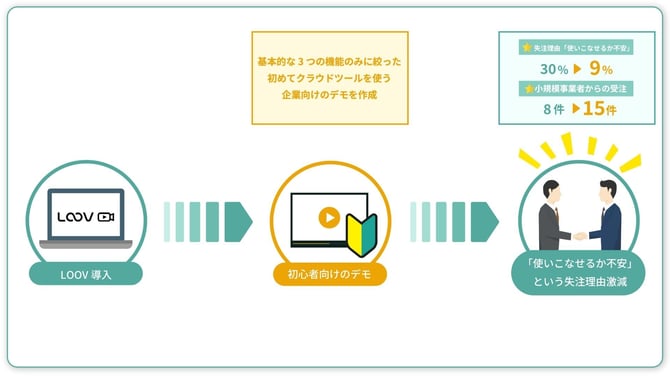 この施策により、「使いこなせるか不安」という失注理由が30%から9%に激減し、特に小規模事業者からの受注が月8件から15件に増加しました。