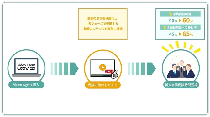 Video Agentによる対面提案動画により、商談の流れを「現状把握」「課題深掘り」「解決策提示」「質疑応答」と構造化。各フェーズで使用する動画コンテンツも事前に準備しました。 ジュニア営業も迷うことなく商談を進められるようになり、平均商談時間が60分に短縮。