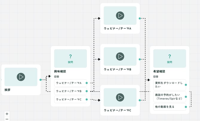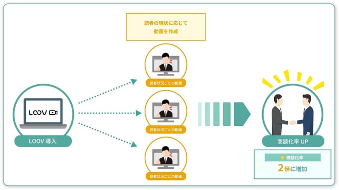 LOOVでの新規撮影時に、「業界別(4パターン)」×「検討フェーズ別(3パターン)」の計12パターンを1日で効率的に収録。例えば「製造業×情報収集段階」の読者には、「製造業のDX最新トレンド」から入り、徐々に自社ソリューションへ誘導する構成にしました。 メルマガ配信時は、読者データベースと連携して自動的に最適な動画URLを差し込み。