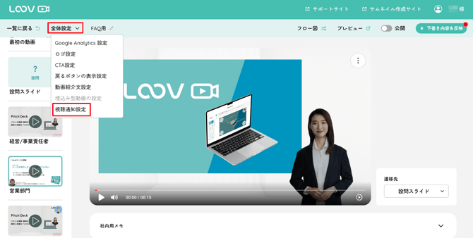 メニューから「全体設定 > 視聴通知設定」をクリック