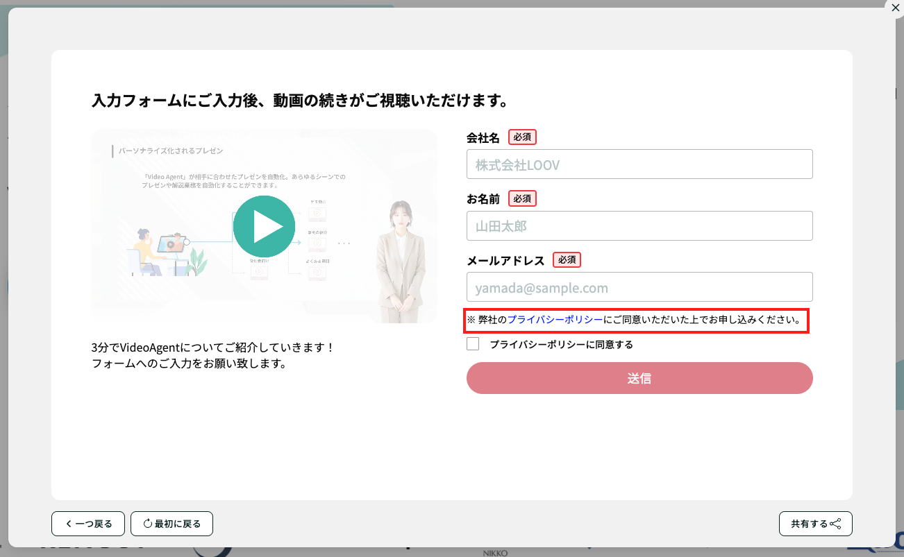 プライバシーポリシーのリンクを明記のうえ、チェックボックスで同意を促す運用が可能です。