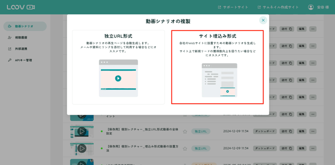 動画の形式が「独立URL形式」になっている可能性があります。 この場合、サイトへの埋め込みはできないため、「サイト埋め込み」形式に変更する必要があります。