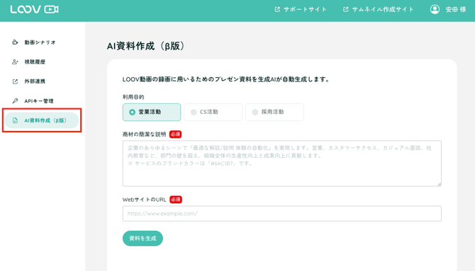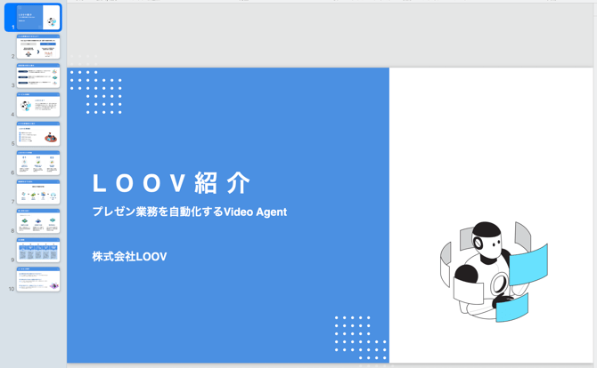 LOOVでは、入力した情報をもとにAIが自動でPowerPoint資料を作成する 「AI資料生成(β)」機能を提供しています。