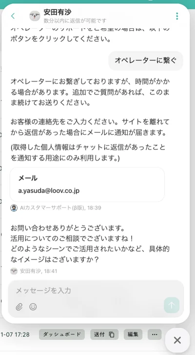 1. メッセージに「対人希望」とキーワードを送信いただくと、「オペレーターに繋ぐ」ボタンが表示され、クリックすると有人対応に切り替わります。