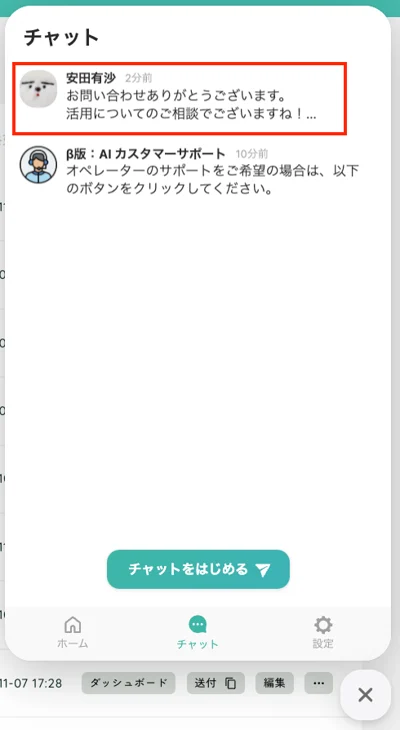3. メッセージをクリックすると、チャットの応対画面が開きます