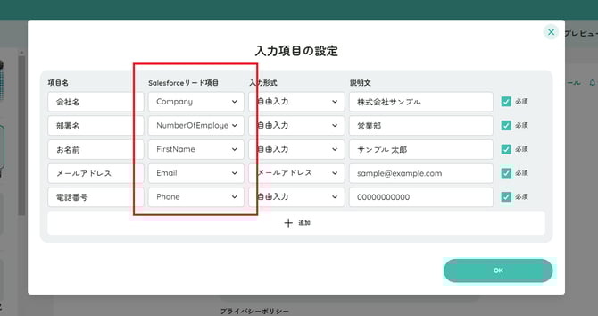 フォーム内の入力項目に対して、同期したいSalesforceのリード項目を設定できます。