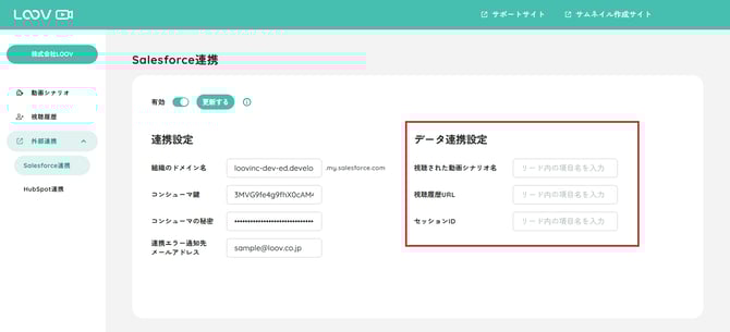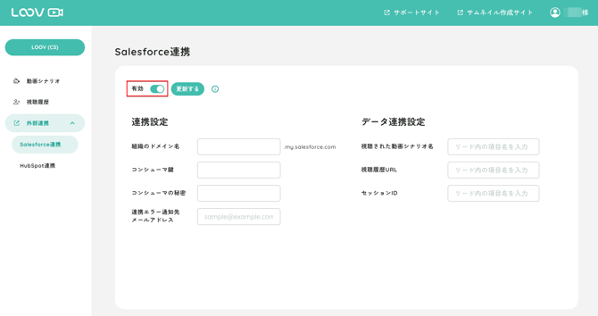 1. LOOV管理画面 > 外部連携 > Salesforce連携 を開き、以下を入力します:
