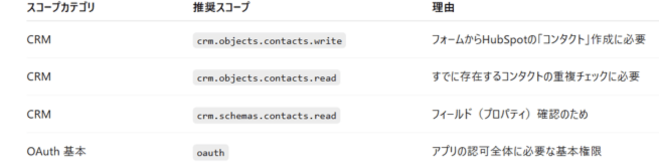 ※スコープは、HubSpot上で外部アプリにどの範囲までアクセスを許可するかを決める設定です。