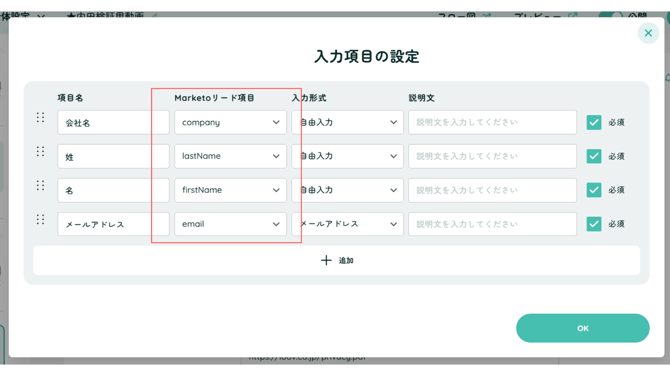フォーム内の入力項目に対して、同期したいMarketoのリード項目を設定できます。