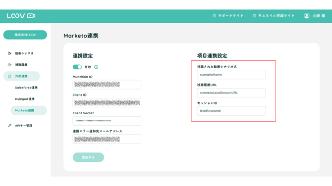 LOOVの管理画面 > 外部連携 > Marketo連携 を開き、トグルスイッチを「有効」にします