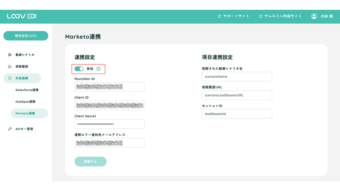 LOOVの管理画面 > 外部連携 > Marketo連携 を開き、トグルスイッチを「有効」にします