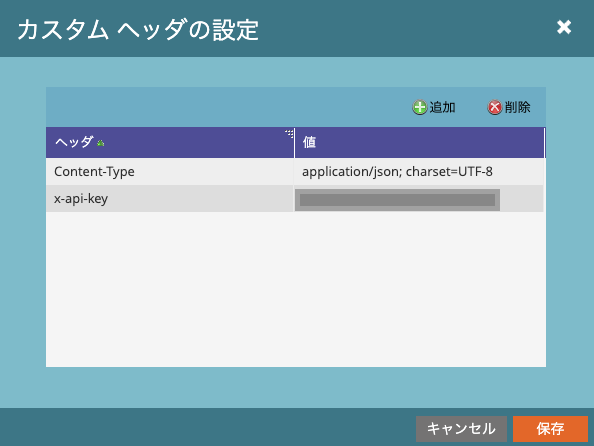 「カスタムヘッダの設定」> 「追加」にて、以下を入力します。
